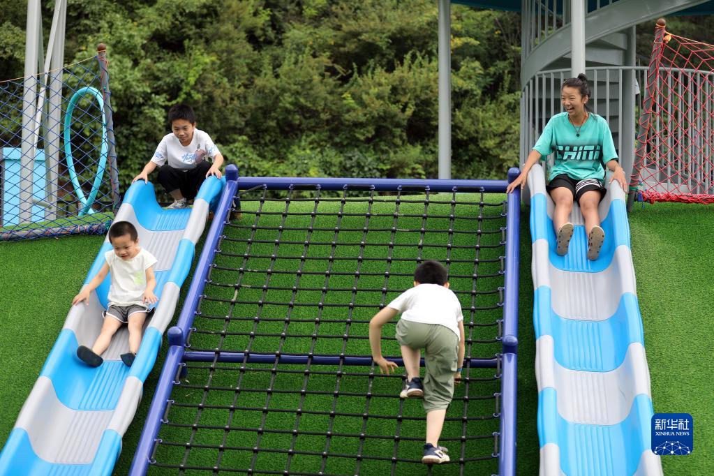 8月8日,小朋友在灤平縣熱河中藥花海小鎮一處游樂(lè )園休閑游玩。