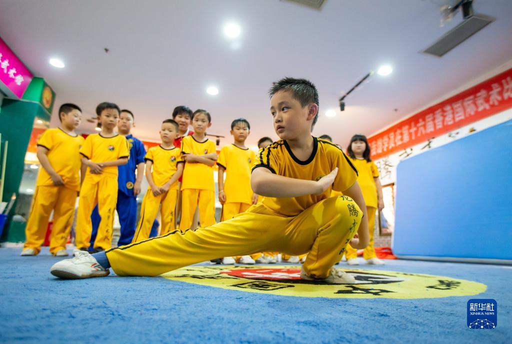 8月8日,在江蘇省海安市海安街道一武術(shù)館內,小朋友在練習武術(shù)。