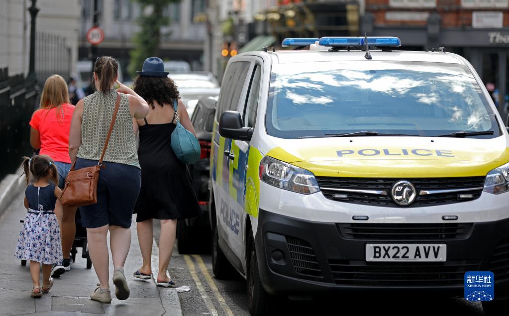 8月8日,人們從英國倫敦街頭的警車(chē)旁走過(guò)。