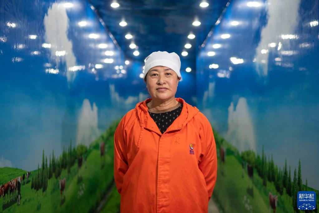8月4日,崔玉梅在車(chē)間背景墻前的肖像照,后面是藍天白云和養牛的牧場(chǎng)。