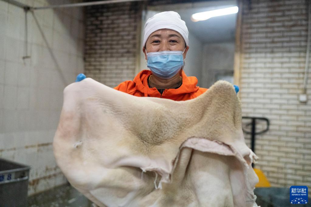 8月4日,崔玉梅在車(chē)間展示牛肚。