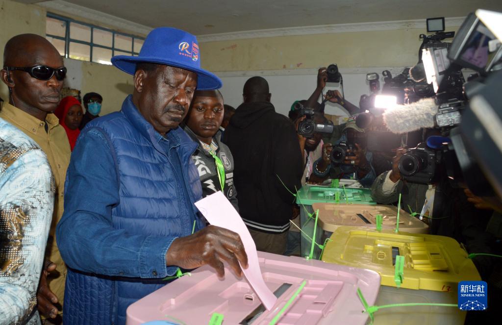 8月9日,肯尼亞總統候選人、反對黨領(lǐng)導人奧廷加在內羅畢一投票站參加大選投票。