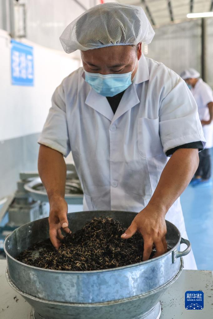 8月9日,工作人員在石阡縣楓香鄉梨子園村茶葉加工廠(chǎng)內對茶葉進(jìn)行烘干。