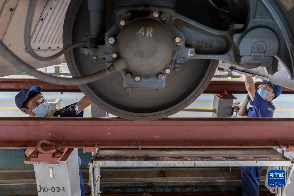 8月10日,動(dòng)車(chē)組機械師對動(dòng)車(chē)組進(jìn)行檢查。 新華社記者 王翔 攝