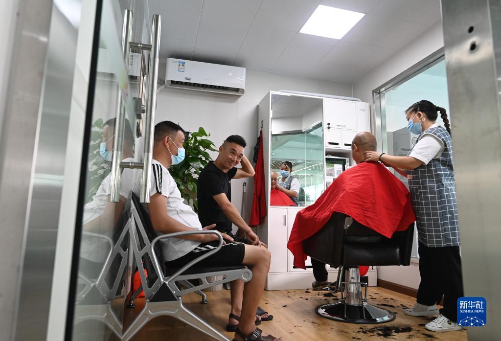 8月9日,船員在服務(wù)區的三峽水上溫情驛站的理發(fā)室內享受免費理發(fā)服務(wù)。 新華社記者 蔡湘鑫 攝