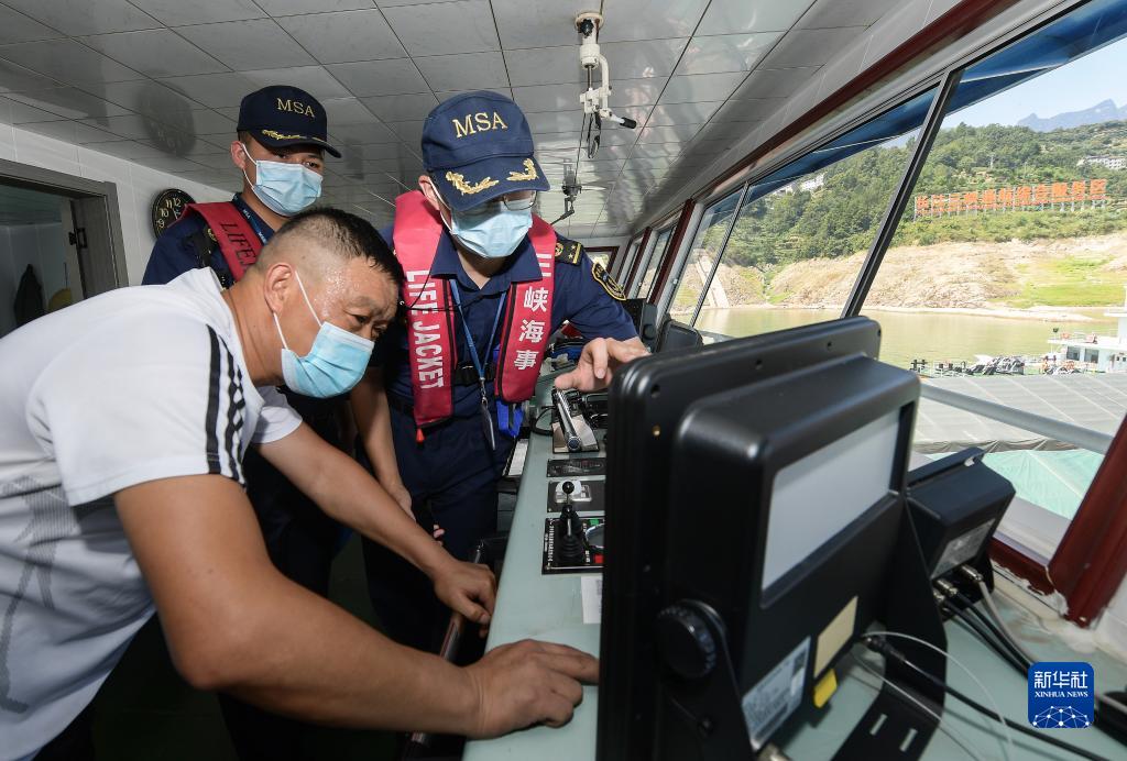 8月9日,三峽海事局執法人員指導船員使用多功能單北斗船載智能終端進(jìn)行船舶過(guò)閘遠程申報。 新華社記者 李賀 攝