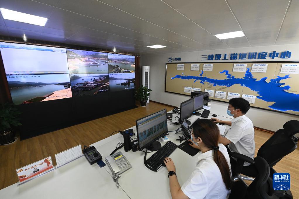 8月9日,三峽待閘錨地管理處工作人員在三峽壩上錨地調度中心指揮調度船舶。 新華社記者 蔡湘鑫 攝