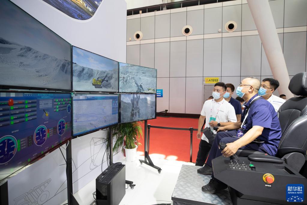 8月10日,人們在2022世界5G大會(huì )展廳里體驗5G網(wǎng)絡(luò )支持下的遠程采礦設備。