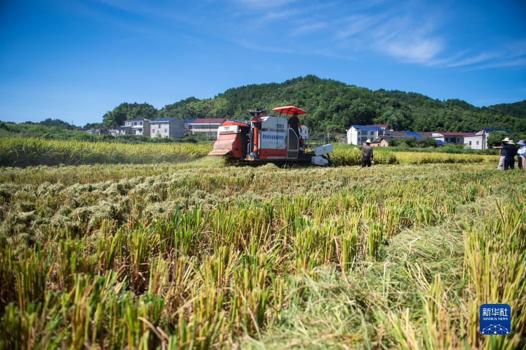 8月10日,在 “一季雜交稻+再生稻”生產(chǎn)模式寧鄉示范基地頭季稻測產(chǎn)驗收現場(chǎng),工作人員駕駛農機收割水稻。