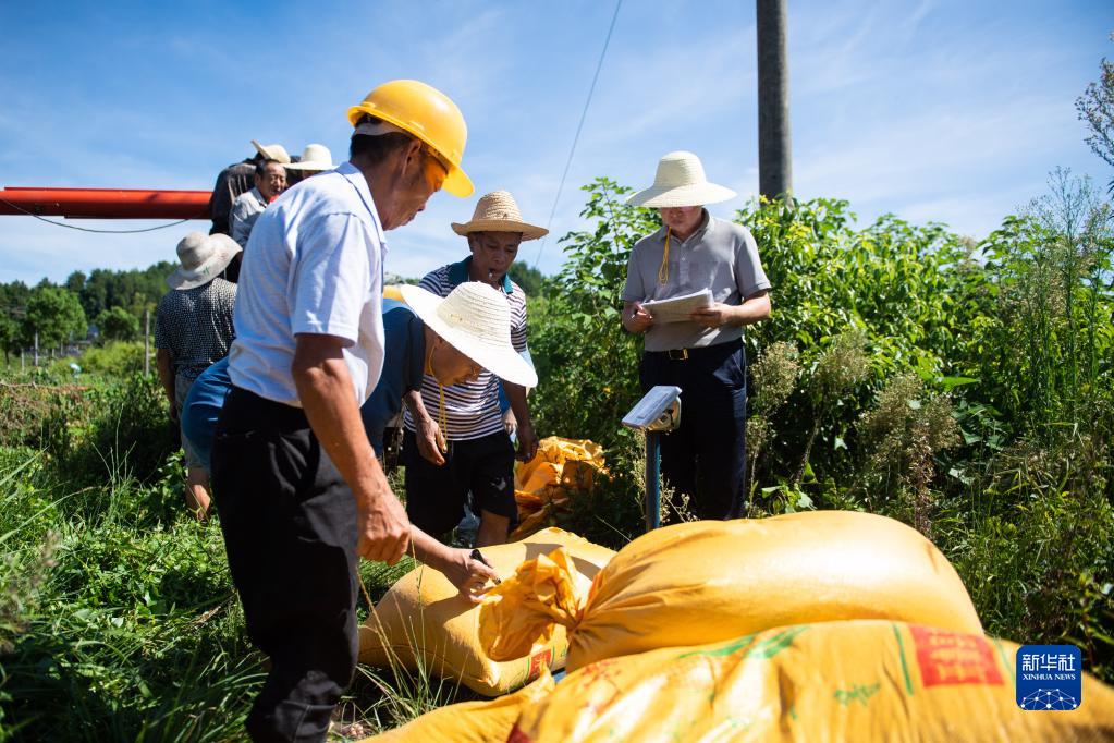 8月10日,在 “一季雜交稻+再生稻”生產(chǎn)模式寧鄉示范基地頭季稻測產(chǎn)驗收現場(chǎng),工作人員為打包好的稻谷稱(chēng)重。