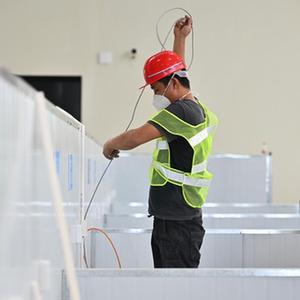 8月10日,工人在三亞第二方艙醫院作業(yè)(無(wú)人機照片)。