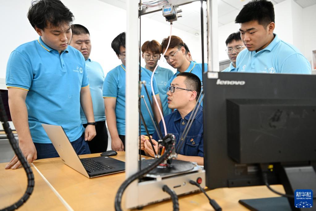 劉世雄(中)在天津機電職業(yè)技術(shù)學(xué)院的教室內給學(xué)生布置任務(wù)(8月8日攝)。新華社記者 李然 攝