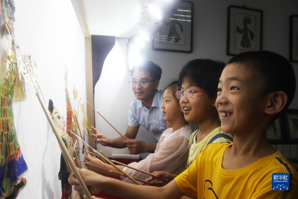 8月10日,在河北省唐山市豐潤區浭陽(yáng)街道新時(shí)代文明實(shí)踐所,小朋友在皮影戲藝人的指導下表演皮影戲。
