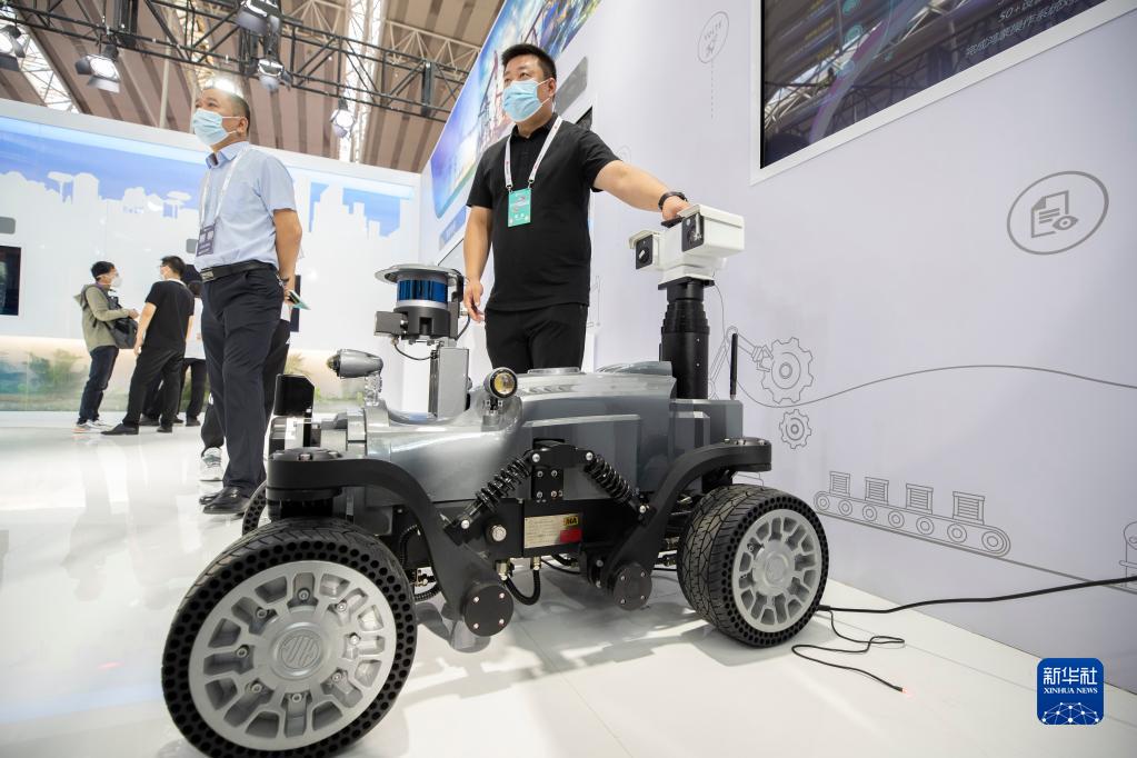 8月11日,在2022世界5G大會(huì )展廳里,參展商介紹5G網(wǎng)絡(luò )支持下的礦上巡檢機器人。