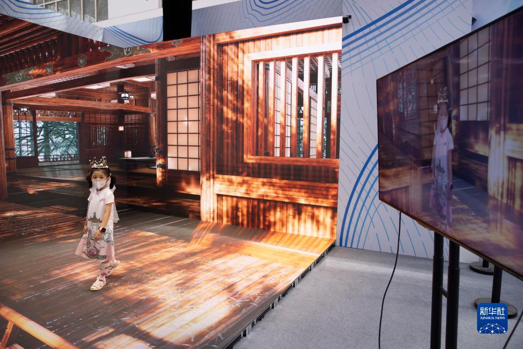 8月11日,在2022世界5G大會(huì )展廳里,小朋友在體驗5G網(wǎng)絡(luò )支持下的虛擬影視制作。
