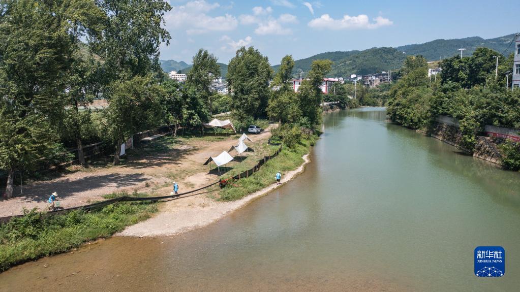 仁懷市五馬鎮生態(tài)環(huán)境保護協(xié)會(huì )會(huì )員在五馬河岸邊清理垃圾(8月4日攝,無(wú)人機照片)。