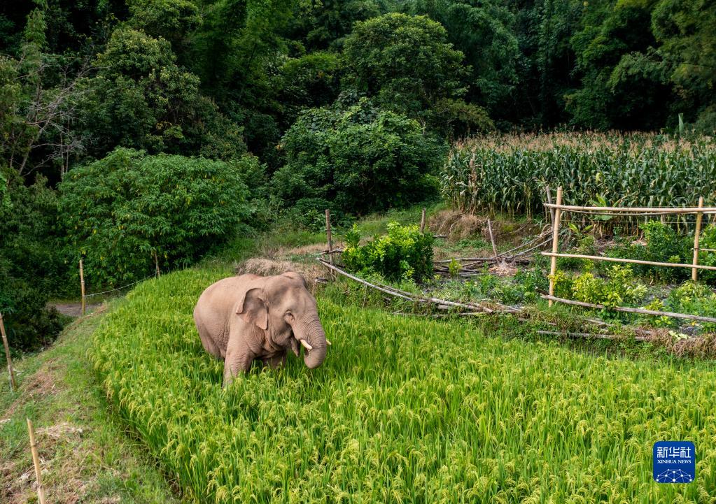 亞洲象在云南省普洱市江城哈尼族彝族自治縣一村莊覓食(無(wú)人機照片,8月1日攝)。新華社記者 江文耀 攝