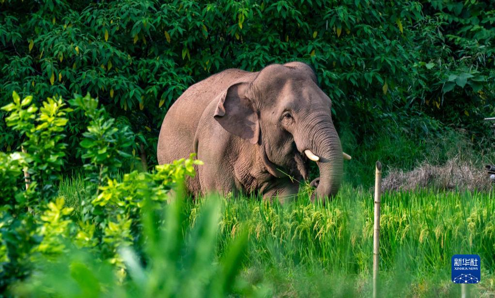 亞洲象在云南省普洱市江城哈尼族彝族自治縣一處村莊覓食(8月1日攝)。新華社記者 江文耀 攝