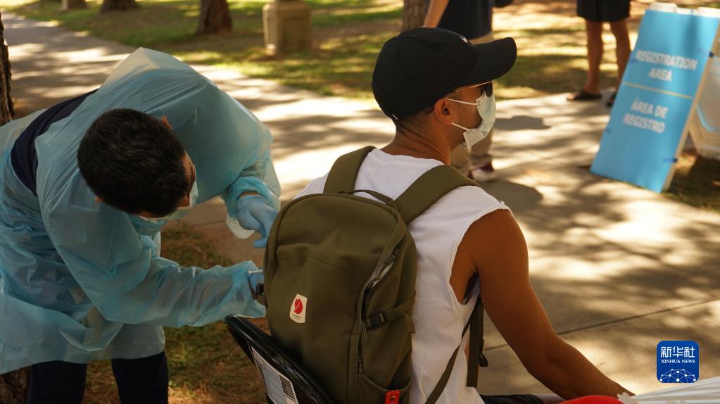 8月11日,醫護人員在美國洛杉磯一處猴痘疫苗接種點(diǎn)為一名男子接種疫苗。