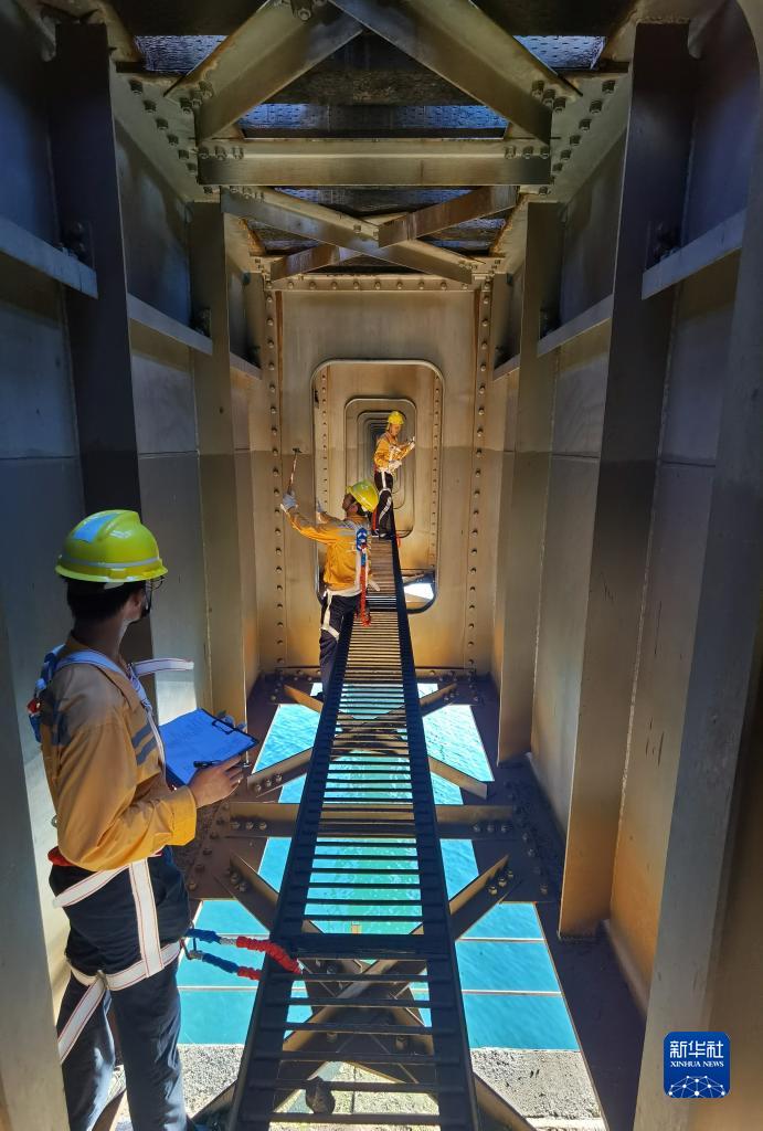 8月11日,橋隧工在滬昆鐵路新舞水鋼梁橋檢查橋墩(手機照片)。