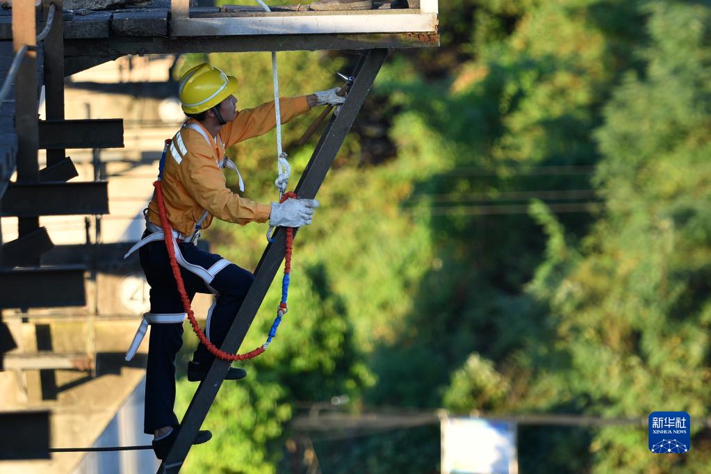 8月11日,在滬昆鐵路新舞水鋼梁橋,橋隧工結束橋墩檢查后返回橋面。