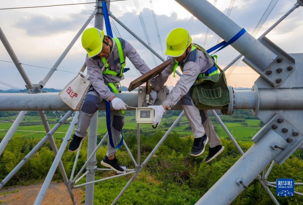 8月11日,安徽送變電工程有限公司廣德運檢站運維人員在維護可視化在線(xiàn)監控設備(無(wú)人機照片)。