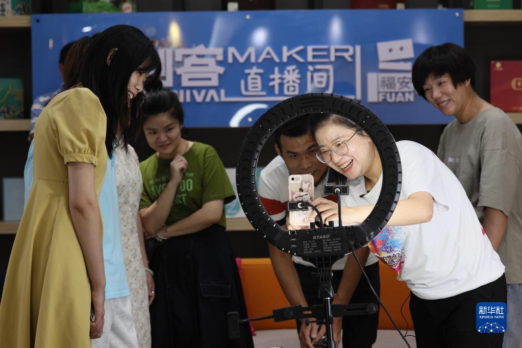 福建省福安市返鄉創(chuàng )業(yè)大學(xué)生林恩輝(右二)在創(chuàng )客直播間向當地青年傳授直播技巧(8月10日攝)。
