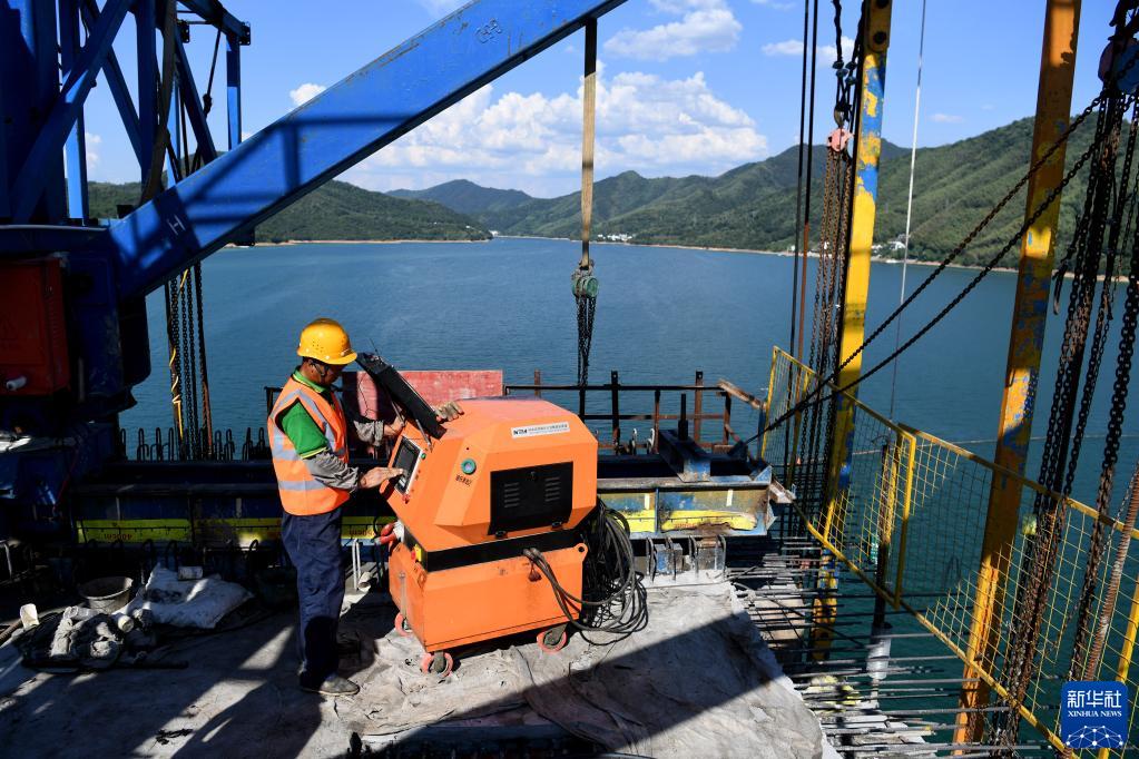 8月12日,工人在中國鐵建大橋局池黃鐵路太平湖特大橋建設工地施工。