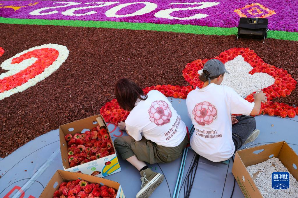 8月12日,工作人員在比利時(shí)布魯塞爾大廣場(chǎng)鋪裝“鮮花地毯”。