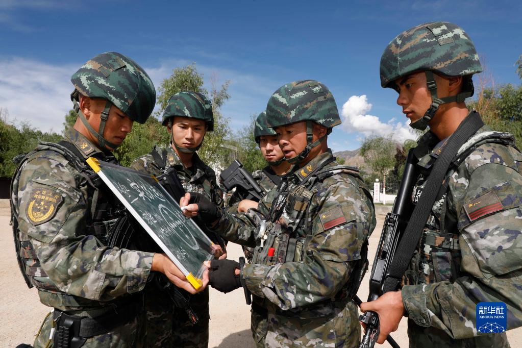 武警西藏總隊某中隊副小隊長(cháng)楊友剛(右二)講解射擊理論(8月9日攝)。新華社發(fā)(李如輝 攝)