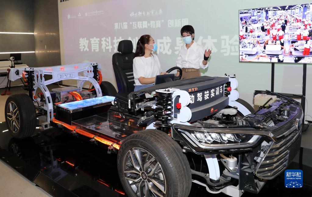 8月13日,參觀(guān)者在第八屆“互聯(lián)網(wǎng)+教育”創(chuàng )新周教育科技創(chuàng )新成果展上體驗自動(dòng)駕駛實(shí)訓車(chē)。