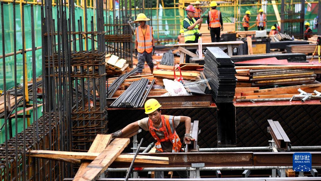 在南玉高鐵玉林北站工地,工人們在鋪設三層樓面(8月12日攝)。