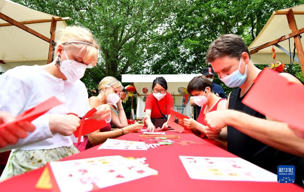8月13日,在德國柏林世界公園,人們在中國展區學(xué)習剪紙。