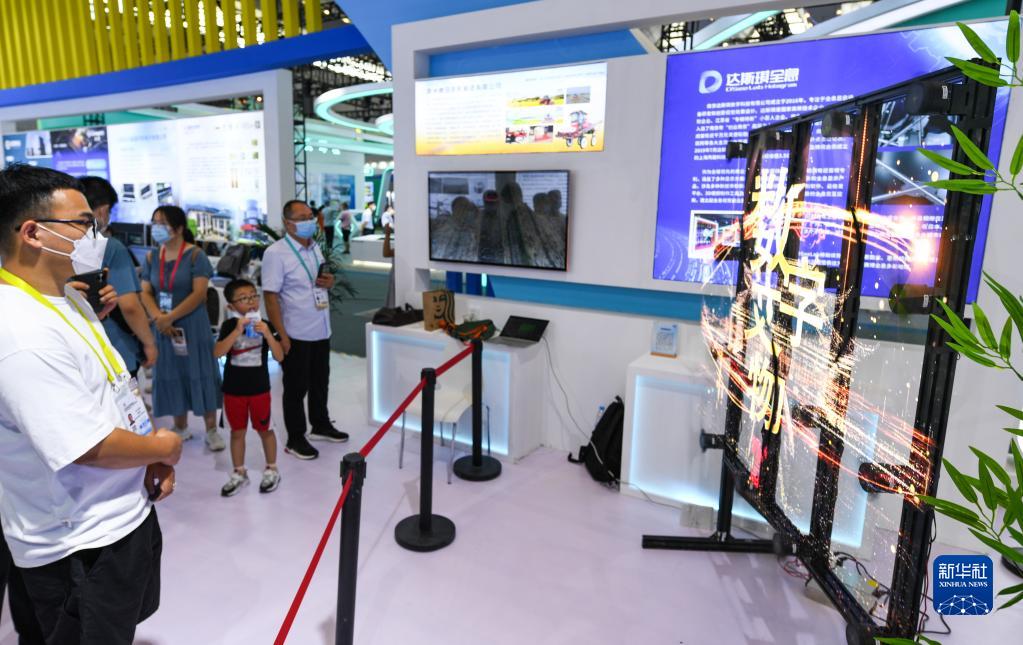 8月14日,在西安國際會(huì )展中心中國館,參觀(guān)者在觀(guān)看全息顯示設備。