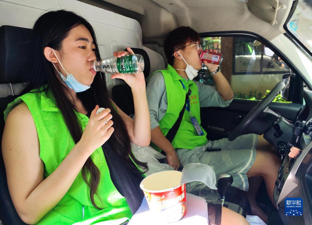 8月14日,張海洋(右)、吳凡力在貨車(chē)上吃午飯。