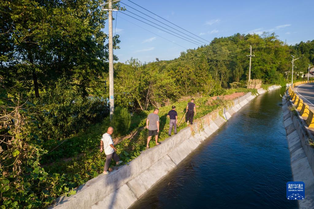 8月15日,在桃源縣三里溪水庫附近溝渠,水庫工作人員在巡堤(無(wú)人機照片)。