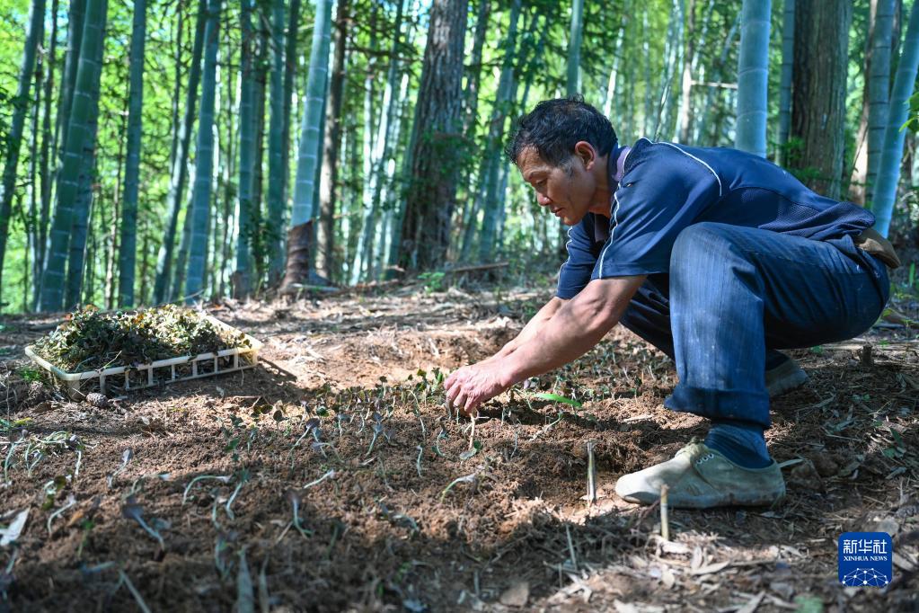 2022年6月23日,村民沈大表在下黨村的大山里種植金線(xiàn)蓮。沈大表和他的兒子種植金線(xiàn)蓮20多畝,預計今年收入超過(guò)30萬(wàn)元。