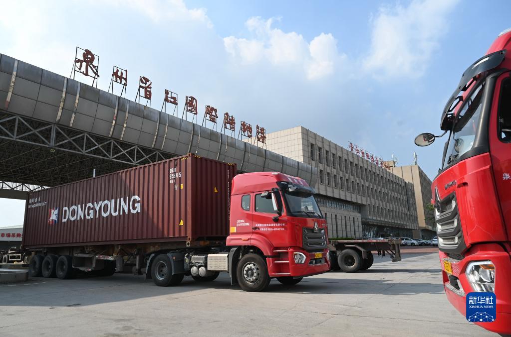 8月15日,開(kāi)往廈門(mén)港的集裝箱運輸車(chē)駛過(guò)泉州晉江國際陸地港區大門(mén)。