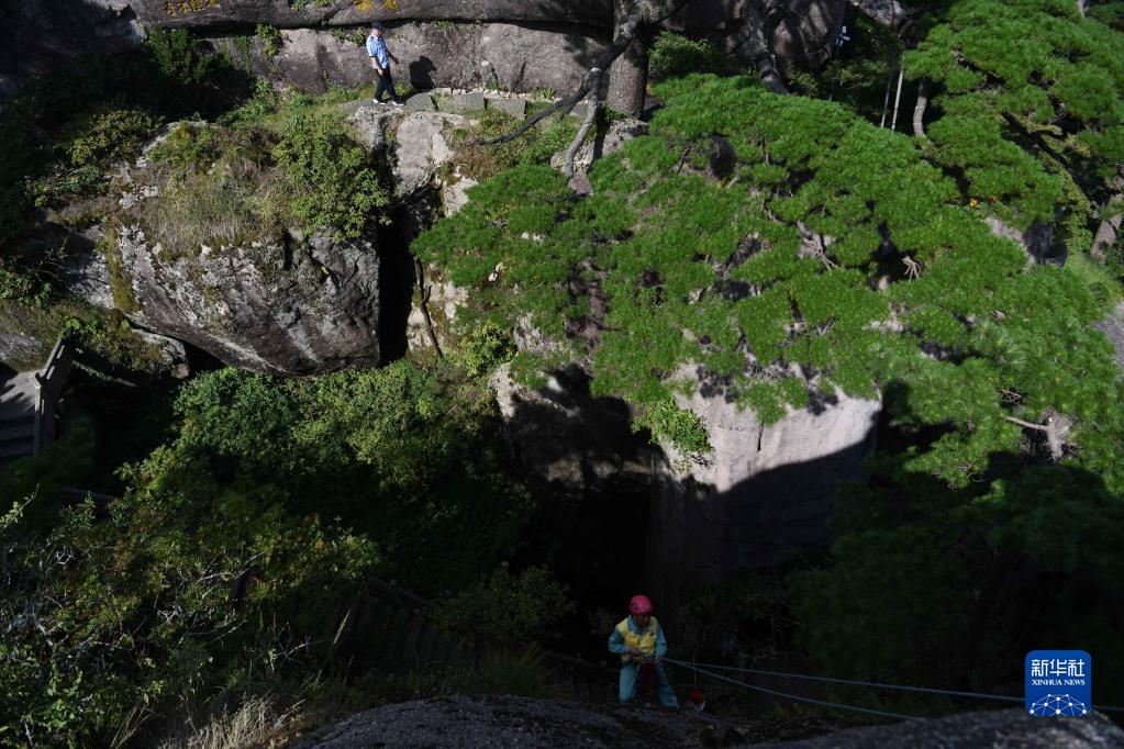 云海、奇石、迎客松……黃山上的這些風(fēng)景令許多游客印象深刻。在游玩時(shí),大家也許還會(huì )遇見(jiàn)這樣一些人:他們或拿著(zhù)設備獨自守護在迎客松旁,或在峭壁上攀爬清理垃圾……他們日復一日地守護著(zhù)美麗的黃山。