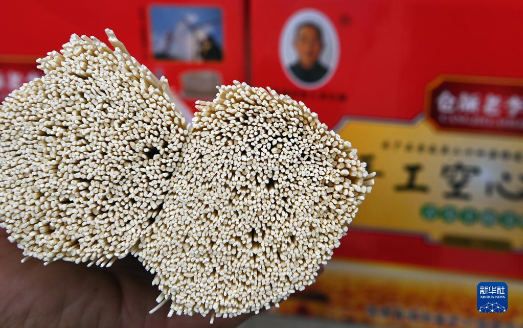 8月16日拍攝的李長(cháng)滿(mǎn)銷(xiāo)售的成品空心掛面。