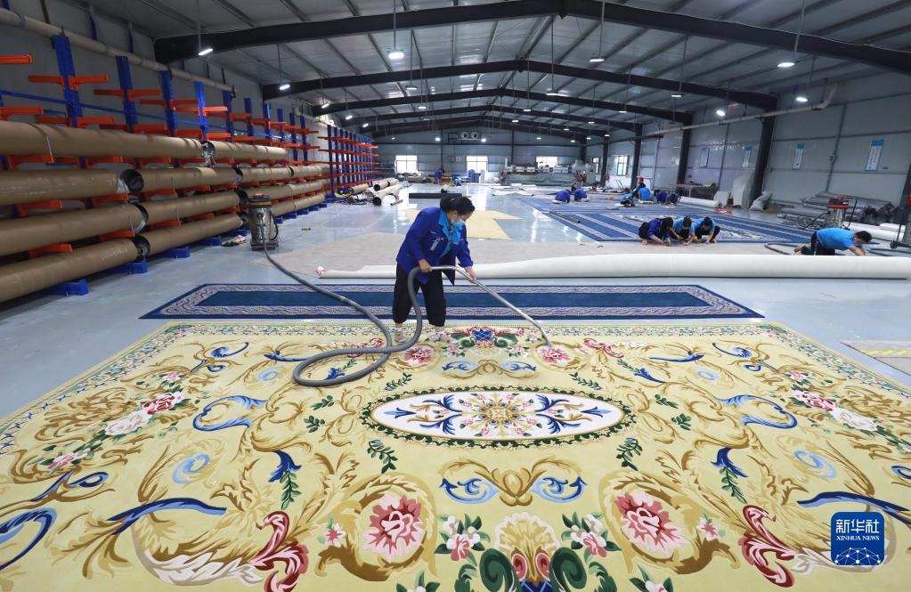 8月17日,工人在河北省石家莊市行唐縣一家外貿地毯生產(chǎn)企業(yè)清理地毯產(chǎn)品。