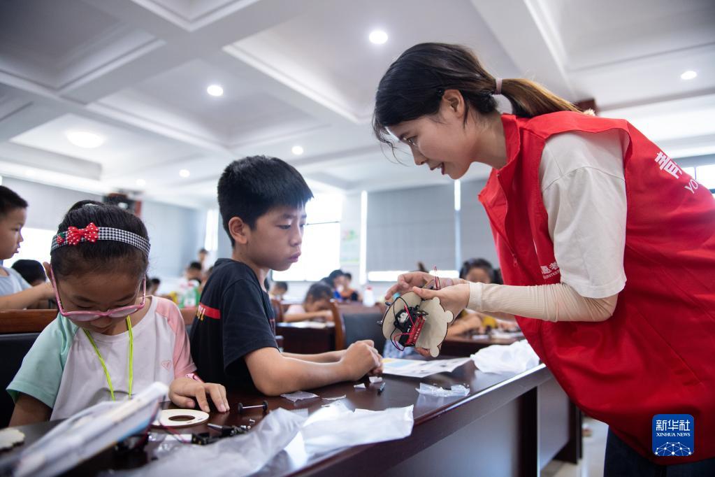 8月17日,在湖南省常德市武陵區南坪街道竹根潭社區活動(dòng)室,志愿者在科學(xué)課上帶領(lǐng)學(xué)生制作“避障小熊”。