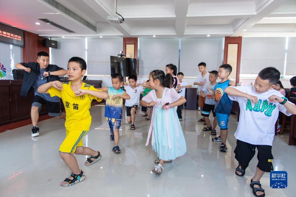 8月17日,在湖南省常德市武陵區南坪街道竹根潭社區活動(dòng)室,志愿者(左一)在舞蹈課上教學(xué)生跳舞。