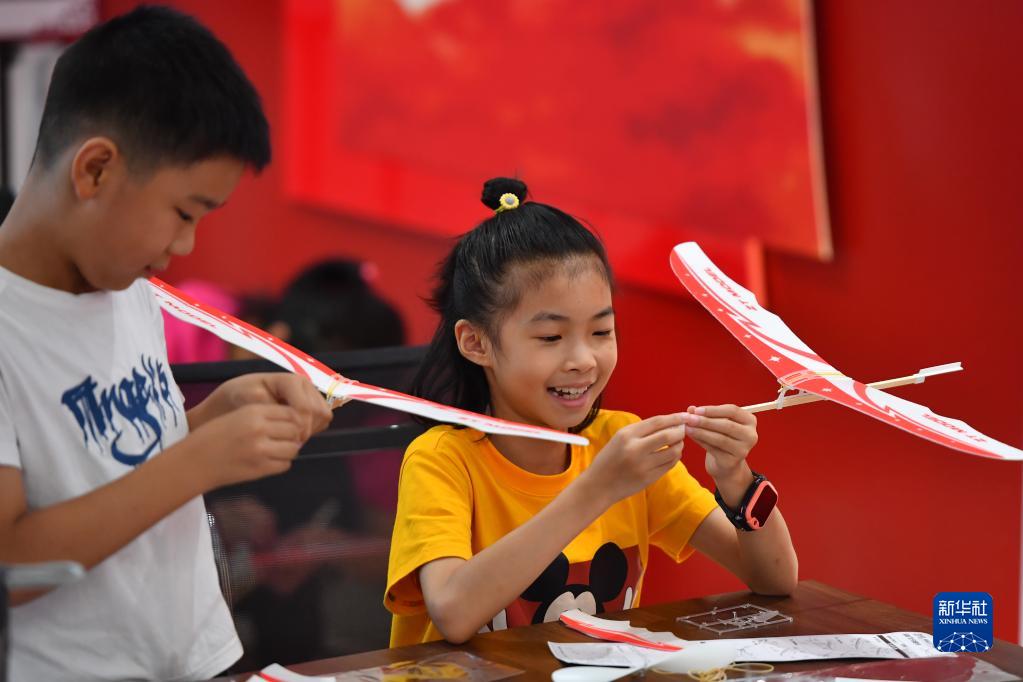 8月17日,在湘潭市雨湖區窯灣街道唐興寺社區,小朋友在體驗航模制作。