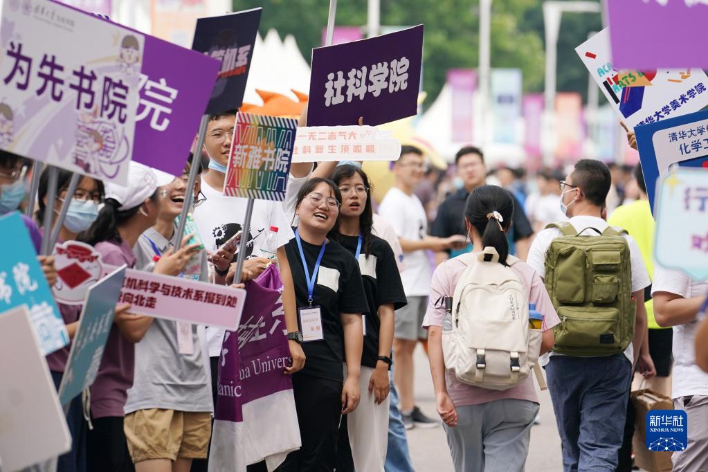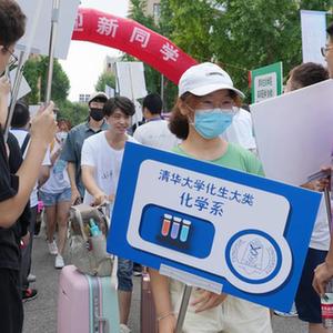 8月17日,在清華大學(xué)迎新點(diǎn),學(xué)生舉著(zhù)院系牌迎接新生入學(xué)。