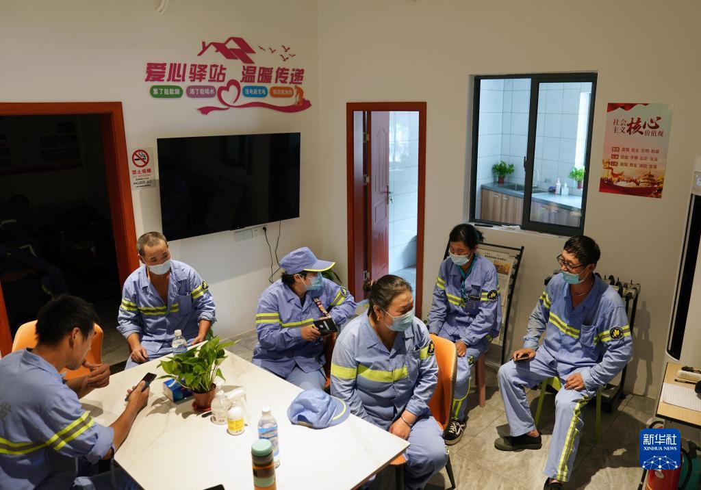 8月16日午間,環(huán)衛工人們在愛(ài)心驛站休息時(shí)聊天。