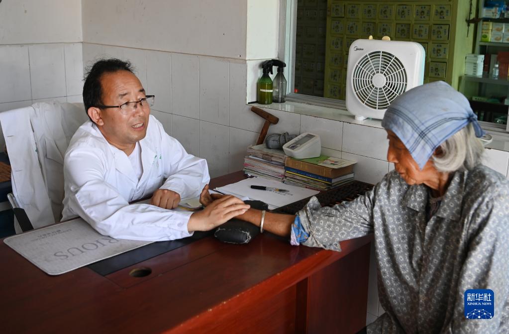 8月17日,村醫牛薛武(左)在村衛生室為村民診斷病情。
