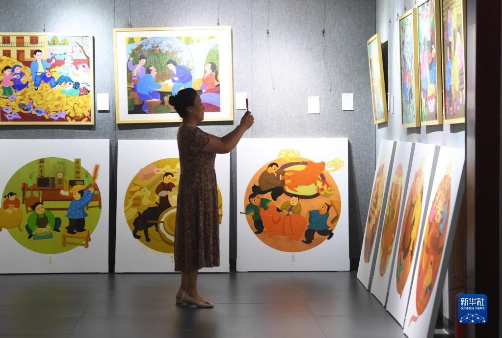 8月18日,在河南省漯河市舞陽(yáng)農民畫(huà)院,觀(guān)眾在農民畫(huà)展覽上拍照。