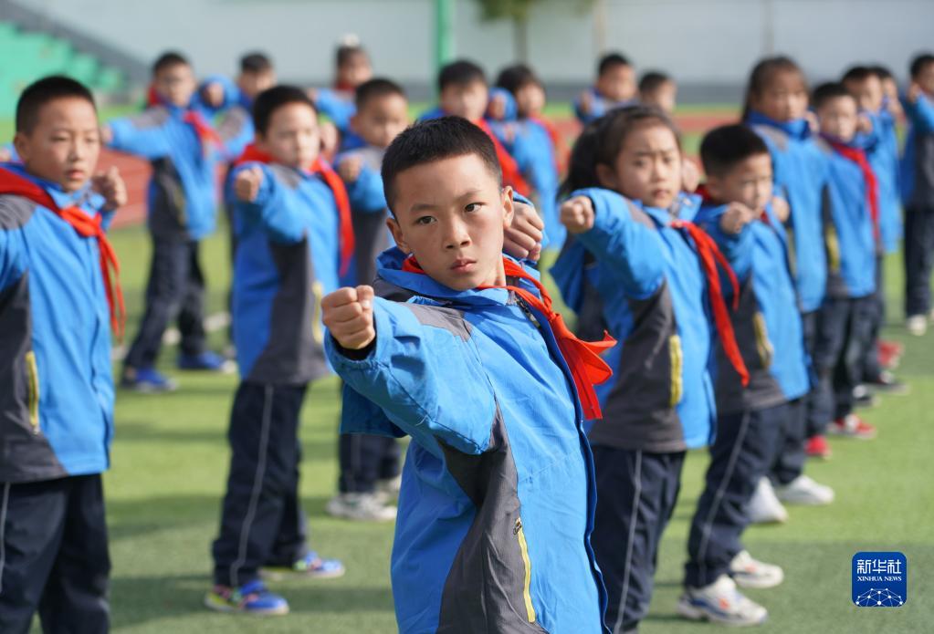 老縣鎮中心小學(xué)的學(xué)生在體育課上練習武術(shù)(2021年11月10日攝)。