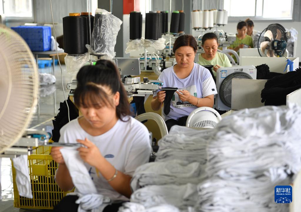 8月17日,老縣鎮一家織襪社區工廠(chǎng)的工人在車(chē)間內忙碌。